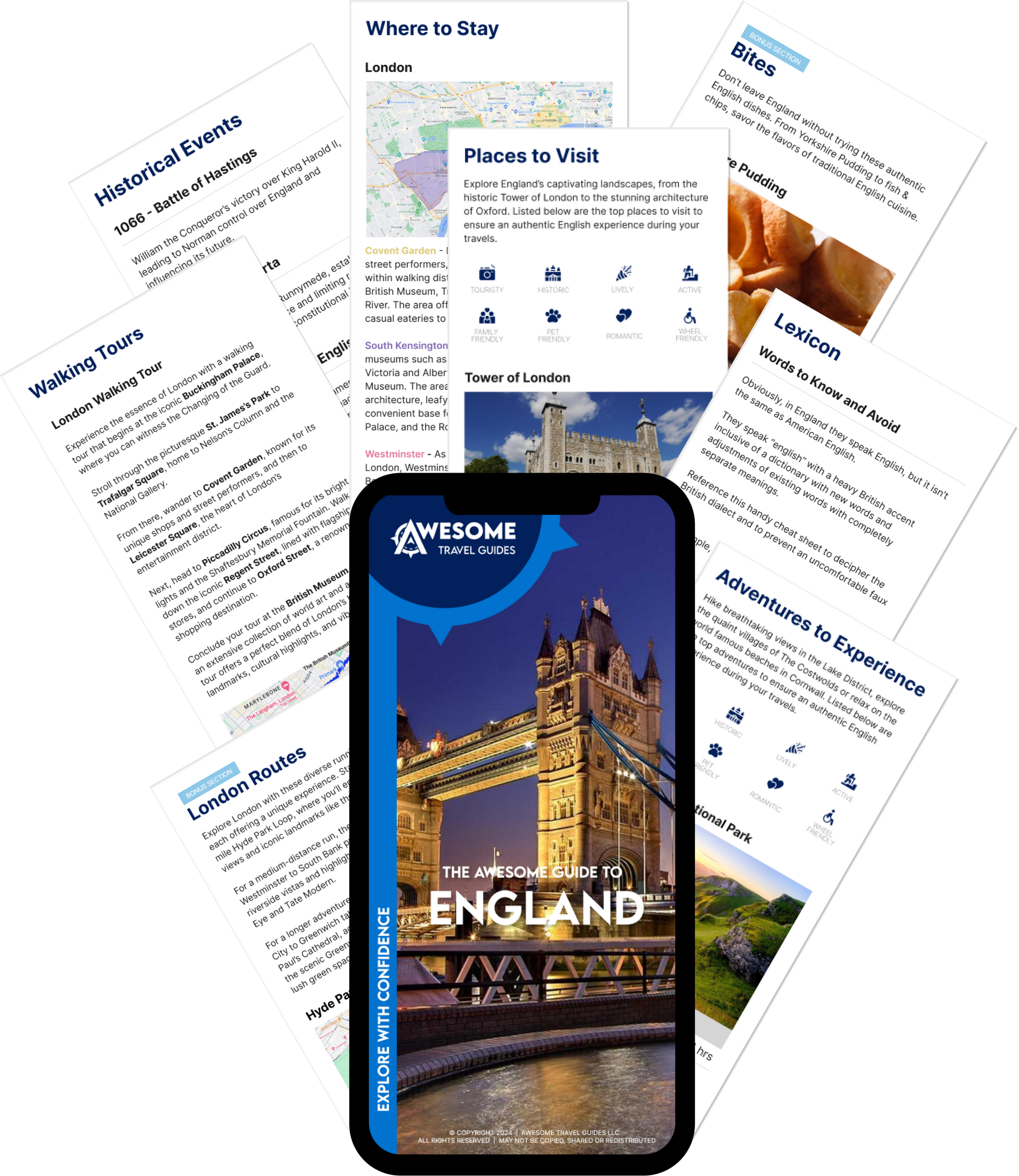 Say goodbye to 400-page guidebooks, endless blogs and travel planning stress! The Awesome Guide to England is a meticulously curated, 29-page digital guide designed for real travelers who want clarity, not clutter. No ads. No fluff. Just everything you need — right at your fingertips.